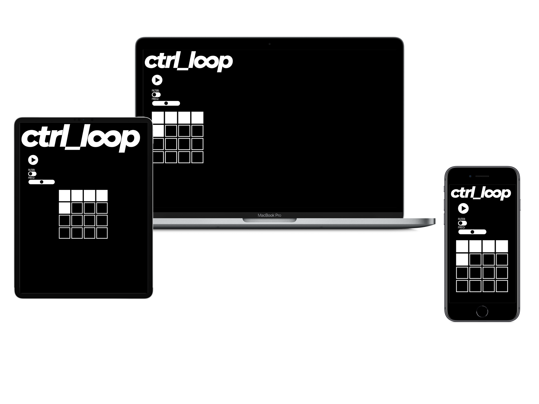 The logo was created in Adobe Illustrator and the controls were based on the classic 90s sampler, the Akai MPC with its 4 x 4 grid of pads.